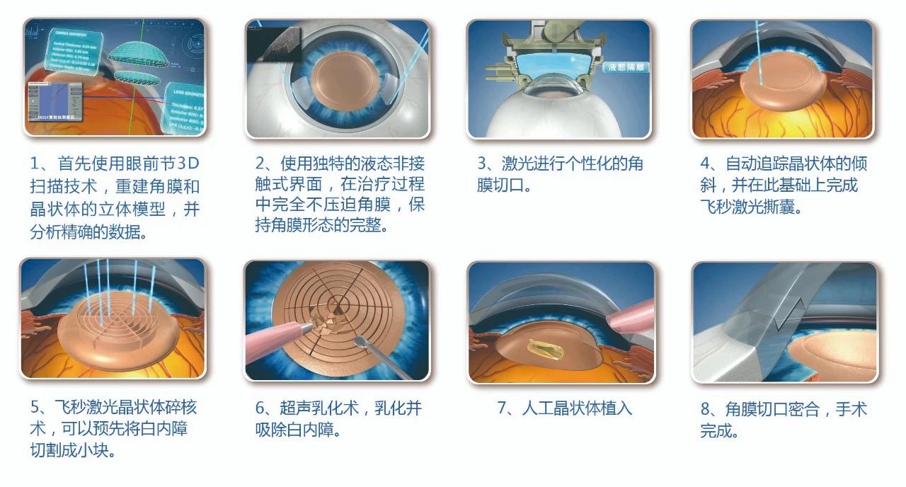 这一手术方式,其撕囊大小及位置均由计算机个性化设定,是标准的圆形;利用激光将浑浊的晶体分隔成小块进行预劈核,可以有效减少超声能量的使用,减少热损伤。飞秒激光辅助白内障手术,在一些疑难病例或高端晶体植入方面有更好的优势,手术时间短且术后并发症发生率低,使人工晶体植入后稳定性更强,术后效果更稳定,预测性更高。